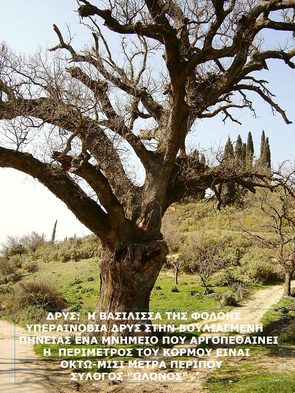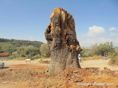 Σήμερα το δένδρο δεν υπάρχει πια Ο Σύλλογος Προστασίας της Φύσης και της Πολιτιστικής μας κληρονομιάς Ερυμάνθου – Φολόης το 2010 είχε προβεί σε καταγγελία, ώστε να σωθεί αυτό το φυσικό και μοναδικό μνημείο του τόπου μας. Αλλά δεν μας άκουσε κανείς….!Σύλλογος Προστασίας της Φύσης και της Πολιτιστικής μας κληρονομιάς Ερυμάνθου – Φολόης «ΩΛΟΝΟΣ»