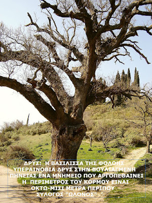 Το διοικητικό συμβούλιο του Συλλόγου Προστασίας της Φύσης και της Πολιτιστικής μας κληρονομιάς Ερυμάνθου- Φολόης, ο «Ωλονός», ευαισθητοποιημένος για την προστασία της φύσης και της πολιτιστικής κληρονομιάς, θέλει να γνωστοποιήσει στο ευρύτερο κοινό την ύπαρξη του υπεραιωνόβιου δένδρου βελανιδιάς (δρυς), στον δ.δ. Βουλιαγμένη του σημερινού δήμου Πηνείας, μοναδικό στην Πελοπόννησο και ίσως σ’ ολόκληρη την Ελλάδα. Η υπεραινώβια δρυς αντιπροσωπεύει το μοναδικό και περίφημο δάσος της Φολόης (Κάπελης), της Ηλείας και πρέπει να χαρακτηρισθεί ως «Μνημείο Φυσικής Κληρονομιάς». Για ταυτό ο σύλλογος μας προτείνει να πραγματοποιηθούν ειδικές παρεμβάσεις από τον Δήμο Πηνείας ή από τον νέο Καλλικρατικό δήμο Ήλιδας σε συνεργασία με την Δασική υπηρεσία, να προστατευθεί και να διασωθεί αφού κινδυνεύει άμεσα να ξεραθεί.